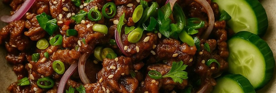 This dish brings together bold Korean flavours with the refreshing crunch of cucumber salad. The spicy-sweet beef pairs beautifully with the cooling, tangy vegetables for a […]